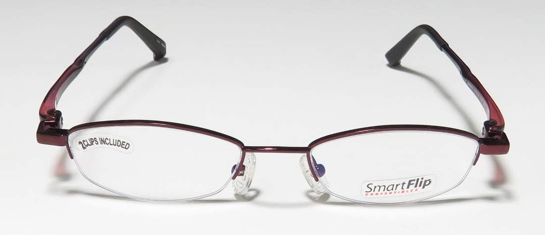 Brand: SmartFlipStyle: 413Gender: unisexFrame Type: half-rimFrame Material: metal & plasticCase: genericSize: 50-18-140Color code: sburgFrame Color: satin burgundyLens Color: demo lensesLens Height: 27 mmThe frame is sold with demo lenses that have a logo stamped on them in ink. The frame can be fitted with real lenses at most optical stores. This frame provides comfortable fit and flatters a variety of face shapes. These eyeglasses are made of metal and high quality, durable acetate plastic. Please keep in mind that original case is not included with this frame. However, we will include a generic hard case or pouch at no extra charge to keep your eyeglasses protected. A set of optional sunglass clip-on lenses is included. Clip-ons are a convenient and affordable way for eyeglass users to shield their eyes from the sun's damaging rays and blinding glare. Clip-on sunglass lenses offer great flexibility for those who do not want to invest in two separate pairs of glasses. They clip on and off easily, usually with one hand.These eyeglasses retail for $90 at upscale stores that carry designer frames. Save your money and get them here! The pictures cannot fully reflect the beauty of this piece of designer eyewear. These eyeglasses look even more elegant in real life.