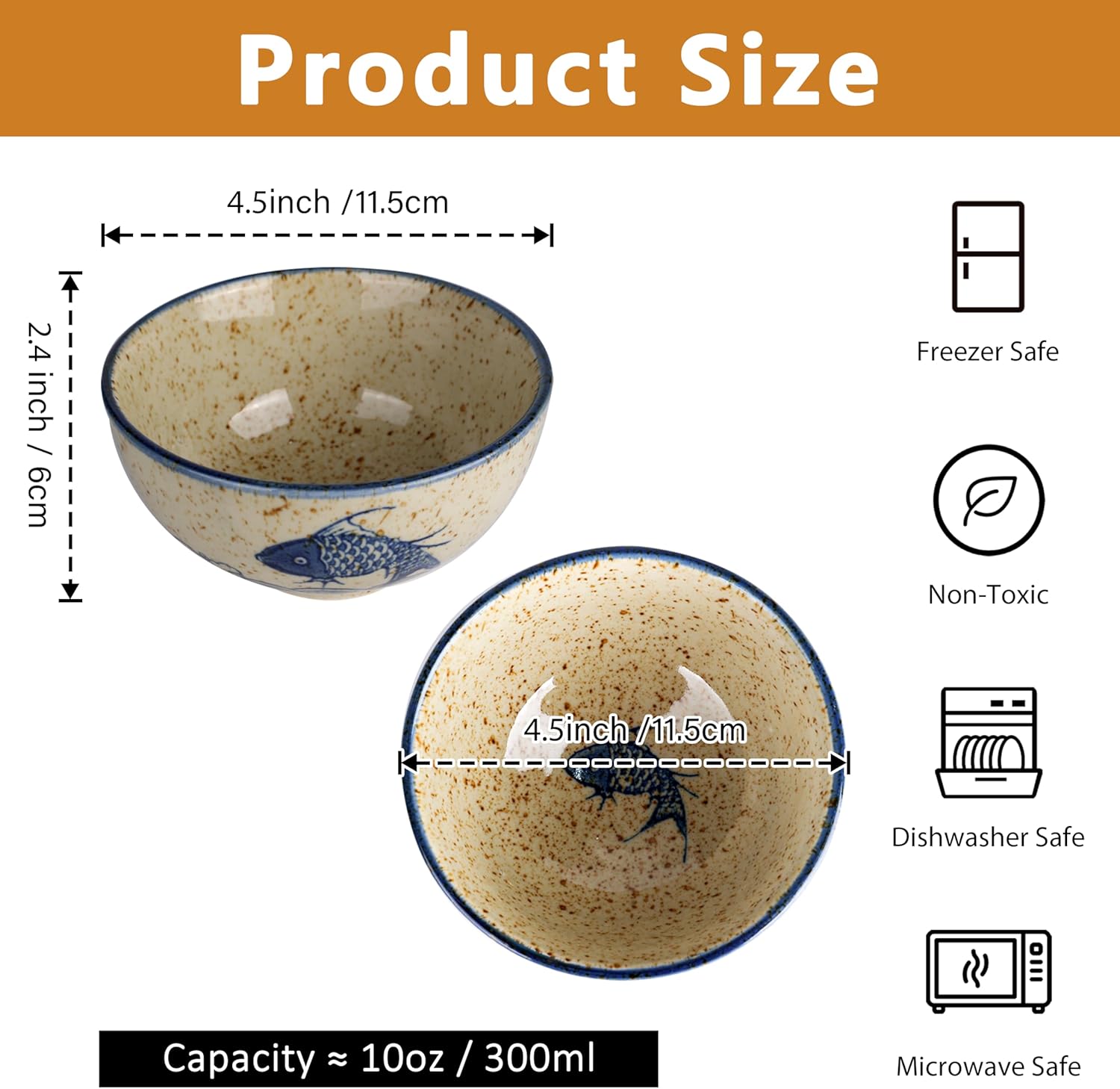 Vitrignis 4.5in Retro Japanese Rice Bowls - Hand-Painted Ceramic Bowls Set Of 6 - Small Soup Bowls For Cereal, Salad, Dessert, Ice Cream, Rice, Noodles, Dishwasher Microwave Safe