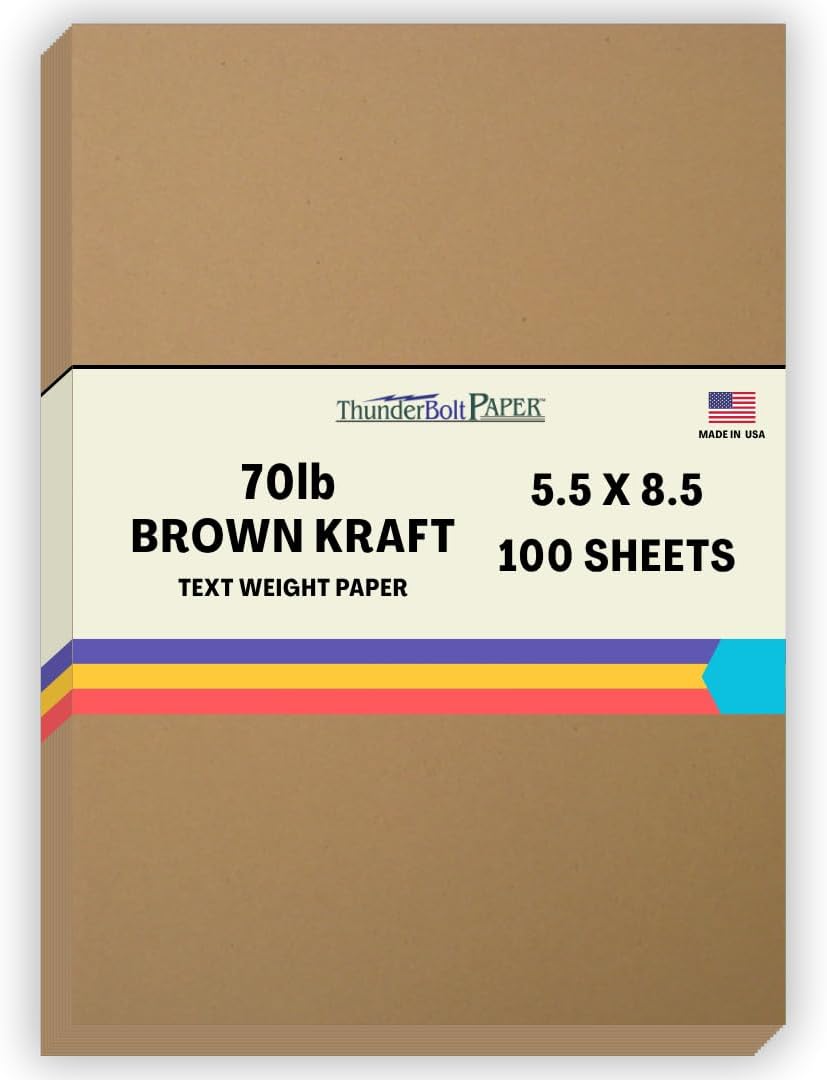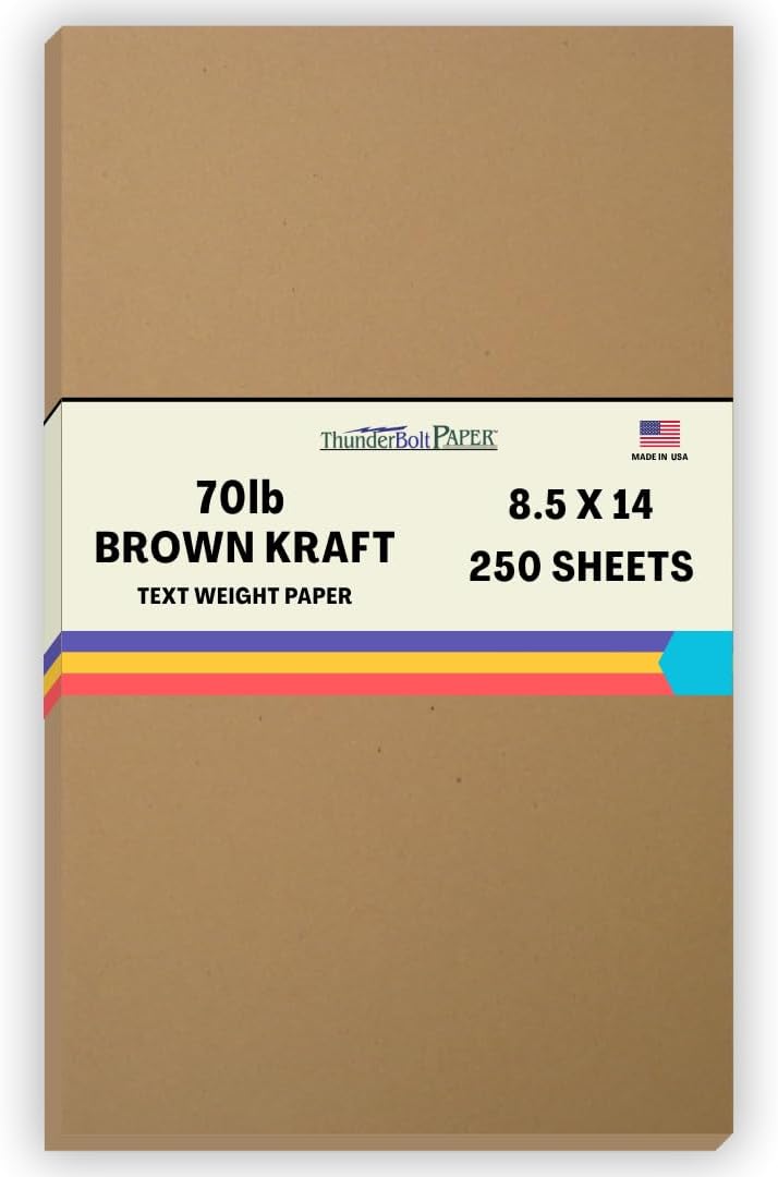 Bring natural warmth and texture to your creative projects with brown kraft fiber 70 lb text paper. This 104 gsm text weight paper is equivalent to 28 lb bond, offering a bit more thickness than standard 20 lb copy paper while remaining lighter than cardstock for flexible handling. The earthy brown kraft color pairs beautifully with darker inks, and subtle darker fiber specks give it the distinctive character of handmade paper. The smooth printable surface runs cleanly through most inkjet and laser printers, making it ideal for invitations, scrapbooking, posters, and DIY crafts. Earth tone enthusiasts will appreciate the natural look and fiber-rich texture. Acid and lignin free for archival safety and crafted from 30% post-consumer recycled content, this paper blends sustainability with creative appeal. Proudly made in the USA, every package is protected with corner guards to ensure sheets arrive in pristine condition.