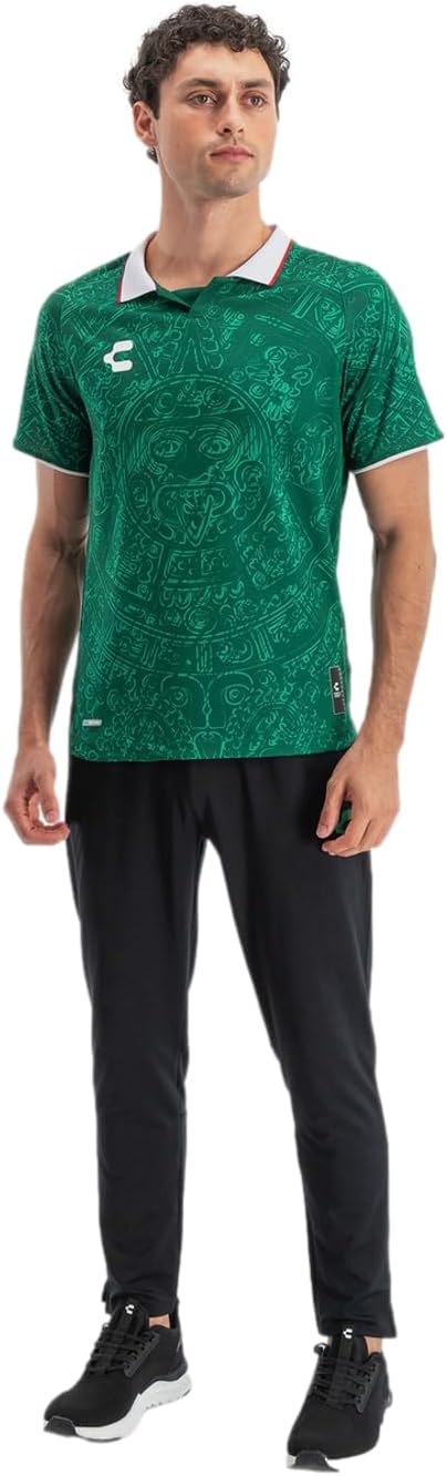 The Charly Men's Soccer Mexico 24 Aztec Heritage Black & Green Jersey is a masterpiece that unites history and style in a single garment. Inspired by the legendary 1998 Mexican National Team jersey, this exclusive edition jersey is much more than just a uniform - it is a symbol of our identity. The design, enriched with the monumental Aztec Calendar, captures the strength and connection between gods and men, reminding us of our rich cultural heritage. With the phrase "Hermoso Cariño" inscribed on the back, it celebrates the love for our land and history. Made of 100% polyester soft fabric, this jersey offers a comfortable fit and showcases a unique blend of comfort and tradition. Wear this jersey with pride as you represent Mexico's rich cultural heritage on and off the field.
