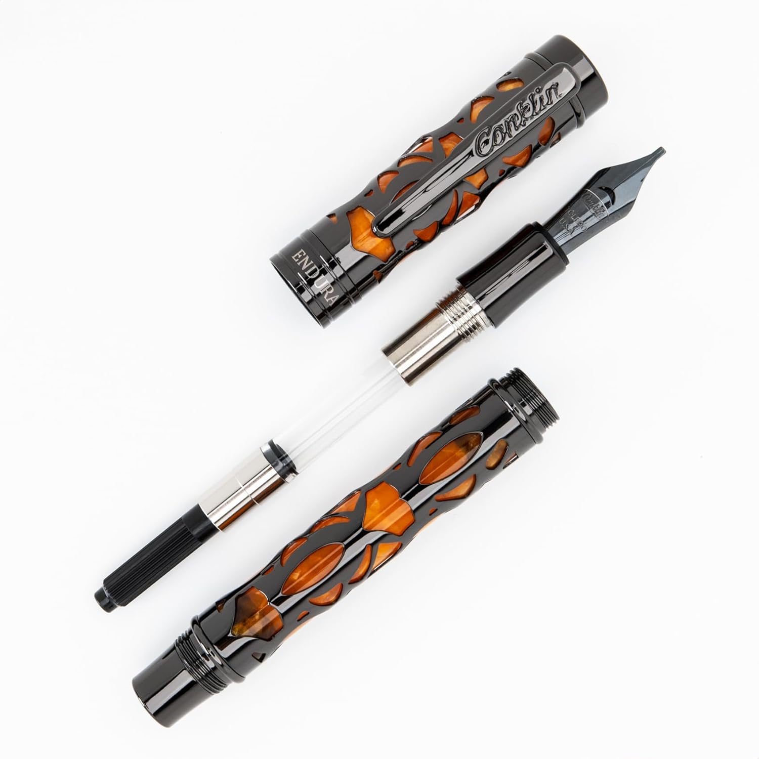 Discover the luxury of the Conklin Endura Deco Crest Fountain Pen in Orange with a Medium nib. Since 1898, the Conklin Pen Company has been at the forefront of crafting high-quality writing instruments. The Deco Crest collection is a nod to the Art Deco movement, combining classic design elements with modern technology. The pen’s orange resin barrel is meticulously handcrafted and polished, while the rose gold filigree adds an element of sophistication and style. The Medium nib, crafted by JoWo in Germany, ensures a smooth and balanced writing experience, making it suitable for both professional and personal use. The nib’s design allows for consistent ink flow, providing a comfortable writing experience with every stroke. This fountain pen is refillable with standard international ink cartridges or the included threaded piston converter, offering convenience and versatility. Packaged in a deluxe gift box, the Conklin Endura Deco Crest Fountain Pen in Orange with a Medium nib is a perfect gift for those who appreciate fine writing instruments. Its elegant design and superior craftsmanship make it a valuable addition to any collection. Trust Conklin to deliver excellence, as it has done for over a century.