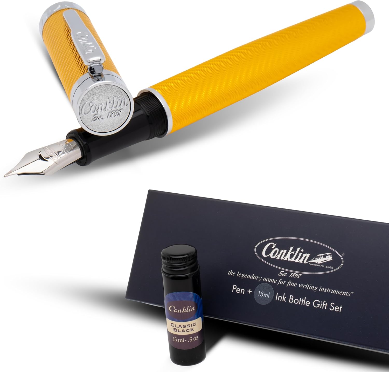 The Conklin Herringbone Signature Fountain Pen in Yellow with Medium Nib combines vibrant design with high-end functionality. The engraved herringbone barrel in bright yellow delivers standout style, while the medium JoWo nib (Germany) offers fluid, expressive writing. Complete with a free Monteverde 15ml ink bottle and presented in a luxury gift box, this pen is the ideal holiday gift or personal writing upgrade.
