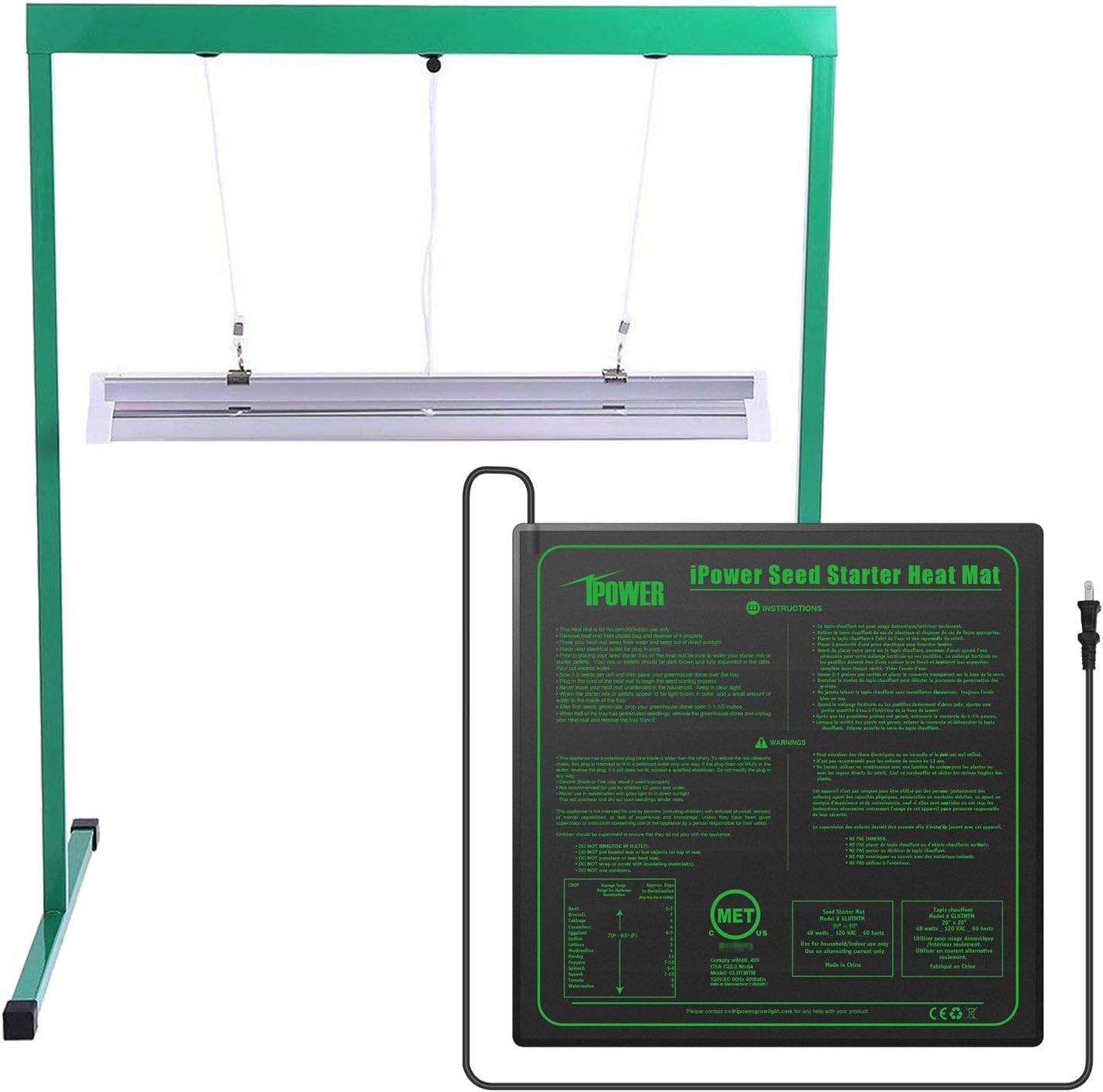10" x 20. 5" Hydroponic Seedling Heat Mat Features:1. 10" x 20. 5" heat mat; Fits under one common seed flat2. Gently warms root area to improve germination3reases success of seedlings and cuttings4. Warms root area 10-20°F over ambient temperature to improve germination5. Provides constant temperature to improve vegetable, plant, herb, and flower seed germination. 6. Waterproof design allows for you to scrub and easier cleaning7. Durable, internal insulated wiring for enhanced safety8. Heavy duty multi-layer construction9. Length of Power Cord: 5. 90ft 10. Specifications: 10"x 20. 5": 17. 5W +/-2W; 20"x 20": 45W +/-5W; 48"x 20": 100W +/-10W24W 2 Feet T5 Fluorescent Grow Light Stand Rack: PARTS LIST2 - Vertical Leg Bar2 - Foot Bar2 - Hex Bolts1 - Hex Key / Allen Wrench1 - Crossbar with Cord & Lock1 - T5 Fluorescent Fixture1 - T5 High Output Fluorescent Lamp1 - Power Cord with On/Off Switch INSTALLATION INSTRUCTIONS: 1. Install the two foot bars onto the vertical leg bars perpendicularly. Align the center of the foot bar to the end of the leg bar with the tapped screw hole. Secure the foot bars to the vertical leg bars with the two 4mm hex bolts with the Allen wrench provided. 2. Set the crossbar on a sturdy flat surface with the square slots facing up. With the foot bar attached, slide the other end of the leg bar into the crossbar. Be sure that the leg bars are seated firmly into the crossbar. 3. Stand the structure up. We recommend positioning it over a chair or other elevated surface in preparation for hanging your light fixture. 4. Set the light fixture under the crossbar as shown in figure and pull down the hanger cables. Attach the hanger clips on the T5 fixture to the rings on the adjustable cables. 5. You may adjust the height of the light fixture by adjusting the length of cord at the center of the crossbar, and setting the height by securing the locking mechanism against the crossbar.