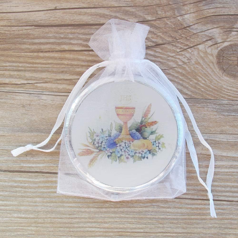 12 Pcs Beautiful Metal Communion compact mirrors feature a round shape with both interior surfaces covered with regular and 3x magnified mirrors. Hinge for opening and closing These compact mirrors are perfect for communion favors. A useful gift, like a compact mirror, is just the type of favor for your guest.